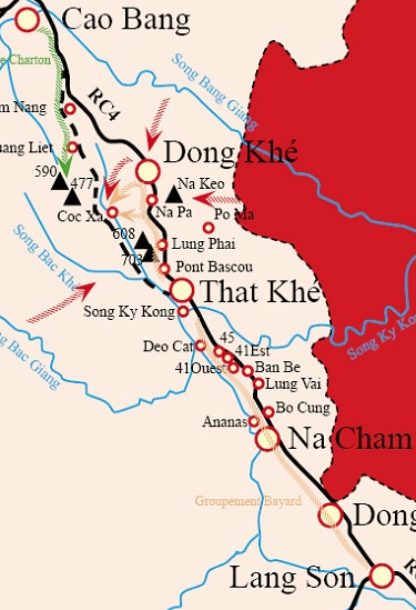 Du 8 au 10 octobre, le groupement tint le pont Bascou au nord de That Khé et occupa la côte 703. Les deux groupes commandos du 3e BCCP accompagnèrent et protégèrent le repli sur That Khé, luttant pied à pied jusqu’à ce que les Viet Minh prennent la côte 703 dans la matinée du 10 octobre.