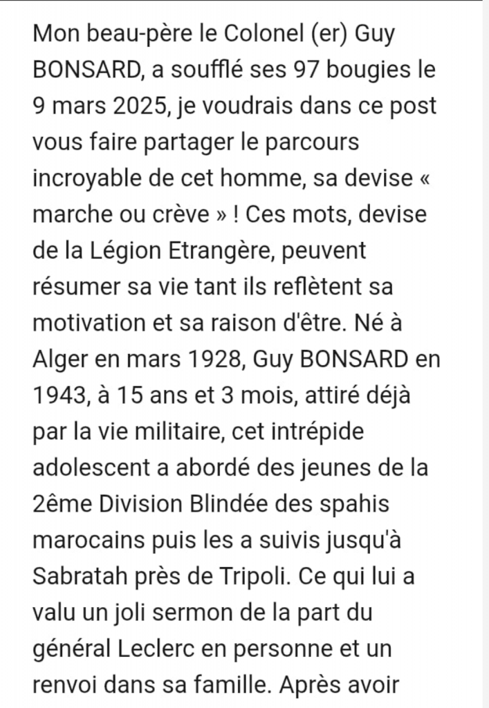 Le colonel (er) Guy BONSARD a rejoint son dernier bivouac…. Ses obsèques auront lieu à Perpignan le vendredi 20 février à 10h00.