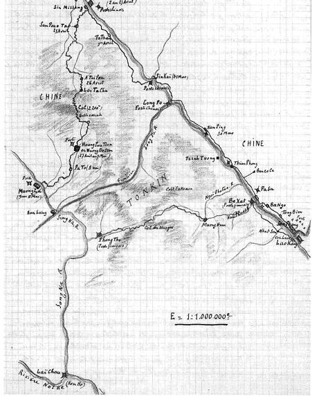 Je devais lever les deux rives du Fleuve Rouge, comme il en avait été convenu. Mais sur le terrain, M. Hoang voulut m'empêcher de passer sur la rive droite et se refusa à m'y accompagner. Mon levé devait s'étendre sur une largeur de 2 à 3 kilomètres à l'est et à l'ouest du Fleuve Rouge (formant frontière) ; il eut la prétention de m'empêcher de quitter les abords du sentier parallèle au fleuve.
