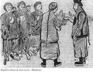 En dehors du "jeu du vin", dont je vous parlerai plus tard, ainsi que des politesses chinoises parfois répugnantes, le Chinois a une habitude vraiment désagréable : il se mouche par terre et l'on croit toujours qu'il va se moucher sur vous. Il n'a pas de mouchoir. Assis à côté de vous, il penche la tête un peu à droite, et, appuyant sa main sur sa narine gauche, il lance par terre (car il y a rarement de plancher dans les yamens), entre vous et lui, avec sa narine droite, ce que nous mettons, d'après lui assez salement, dans notre mouchoir. Je dois dire que son jet est puissant et adroitement dirigé.